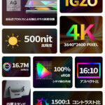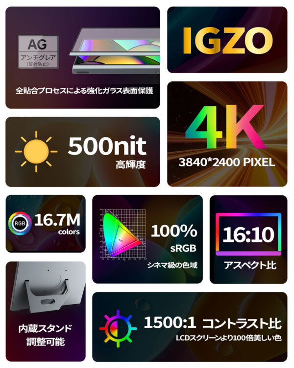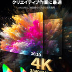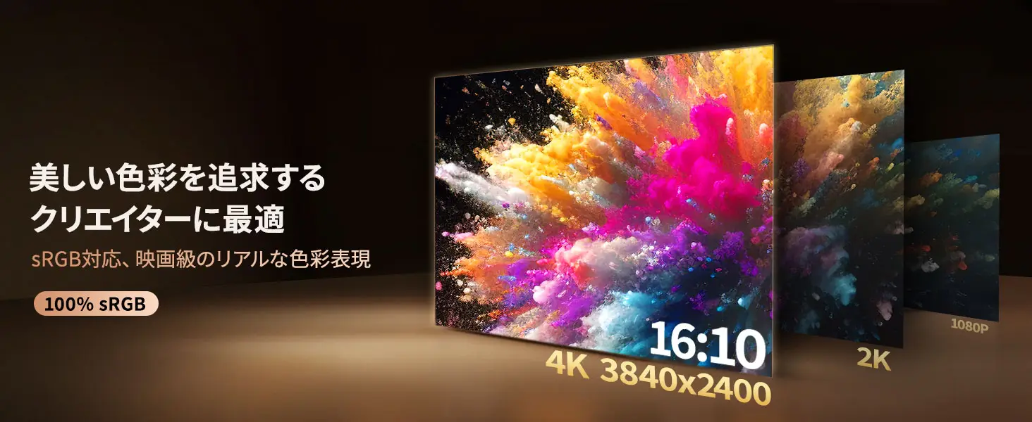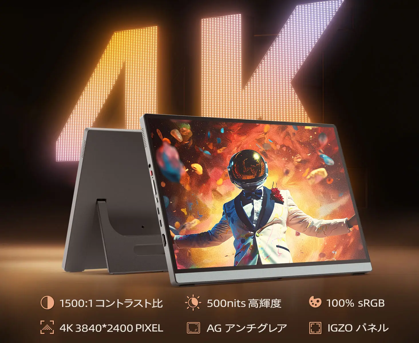• 【3840×2400高解像度】4Kを超えるWUXGA+解像度(3840×2400)に対応し、細部まで鮮明に表示。最大500nitsの高輝度とsRGB 100%の広色域により、写真編集や動画制作などのクリエイティブ作業はもちろん、映画やアニメも本来の色彩で楽しめます。高解像度モバイルモニター4kをお探しの方におすすめ。