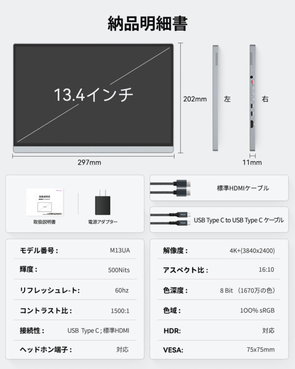 M13UA モバイルモニター 4K 13.4インチ 3840×2400 sRGB 100%色域 モバイルディスプレイ 4K 16:10 AGアンチグレア 非光沢IGZOパネル 500Nits高輝度 サブモニター 軽量 3年保証/USB Type-C/標準HDMI搭載/金属製/VESA対応 ポータブルモニター 自立型スタンド