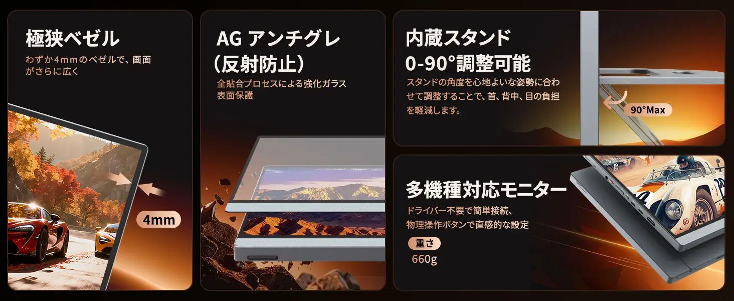 • 【高精細IGZOパネル】シャープ製IGZOディスプレイを採用し、画面表面は強化ガラスのフルラミネーション加工。映り込みを抑えるAG(アンチグレア)処理で、長時間の使用でも目が疲れにくく快適。テレワーク用モバイルディスプレイとして最適です。