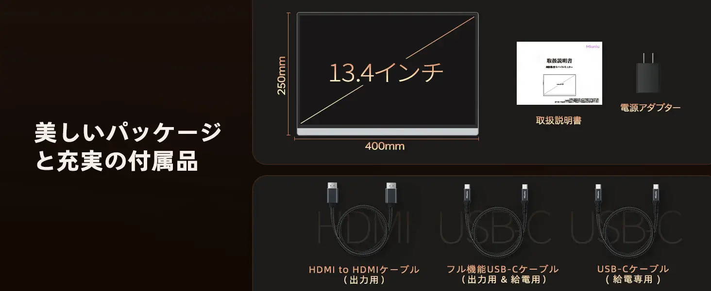 “M13UA モバイルモニター 4K 13.4インチ 3840×2400 sRGB 100%色域 モバイルディスプレイ 4K 16:10 AGアンチグレア 非光沢IGZOパネル 500Nits高輝度 サブモニター 軽量 3年保証/USB Type-C/標準HDMI搭載/金属製/VESA対応 ポータブルモニター 自立型スタンド” の口コミを投稿します