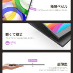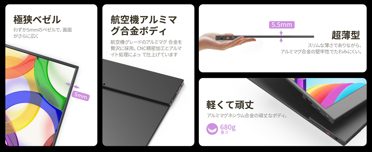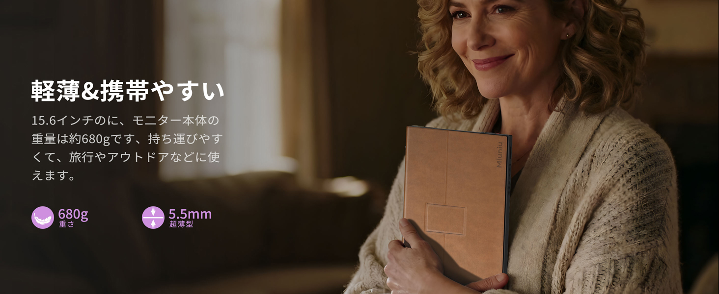 - 【超薄・軽量モバイルディスプレイ】最も薄い部分で約5.5mm、ノートPCと並べても遜色のない超薄型デザインです。A4ノートとほぼ同じサイズ感なので、カバンに入れてもかさばらず、出張や旅行、カフェでの作業など、さまざまなシーンで活躍。テレワーク用のサブモニターとしてはもちろん、外出先でのプレゼンや資料確認にも便利です。
