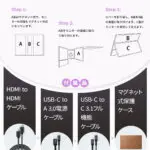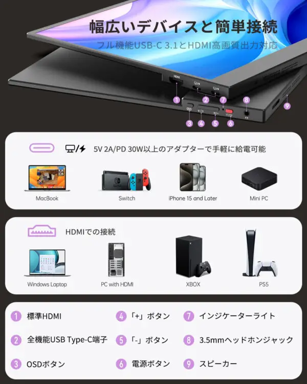 - 【デバイスを簡単拡張】標準HDMI×1と、フル機能USB Type-C×2を搭載。ノートPCやMacBookのデュアルモニター環境も数秒でセットアップ完了。SwitchやPS5、Fire TV Stickとの接続もスムーズで、大画面で楽しめます。さらにiPhone 15に接続すればスマホ画面を約4倍の大きさで表示でき、作業効率も大幅アップ。